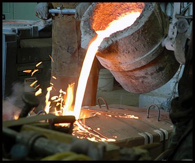 Metal Casting process: A pattern is employed to create the designed shape in the mold. Molten metal is alloyed and brought to the correct temperature, then poured into the cavity or mold. Once the metal has solidified, the casting is removed from the mold for use. Complex shapes can be made from any metal that can be melted. The resulting product can have virtually any configuration the designer desires.